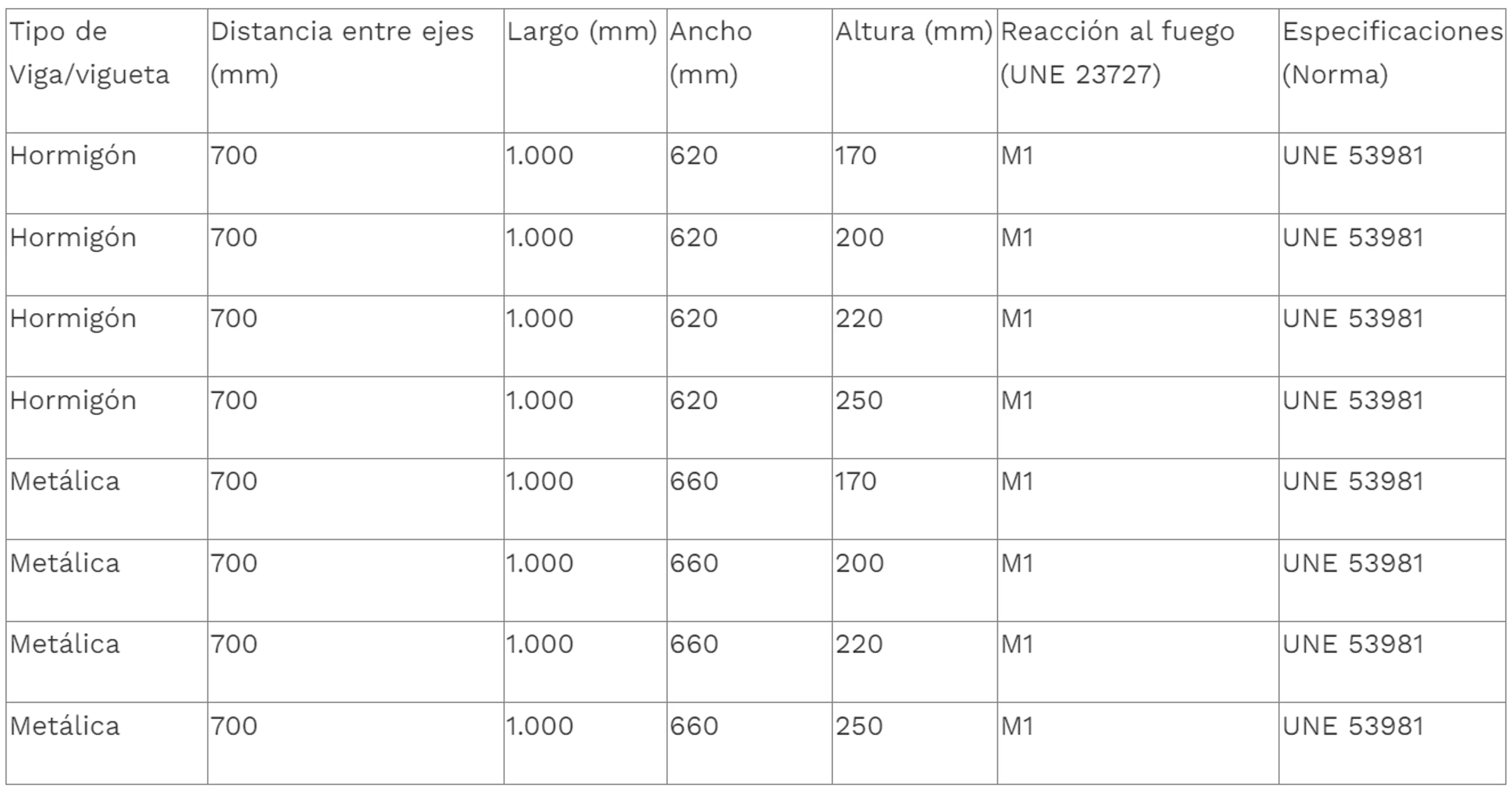 Piezas macizas de Poliestireno Expandido mecanizadas en las medidas solicitadas en función de las necesidades del forjado. Material de gran durabilidad e inocuo para la salud de las personas, siendo 100% reciclable e inofensivo para el medio ambiente.